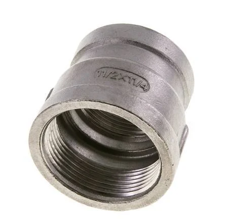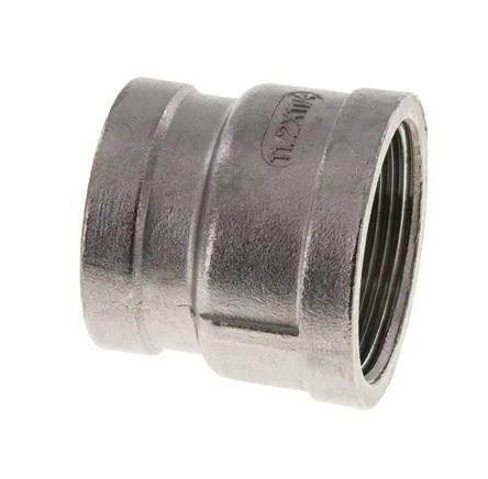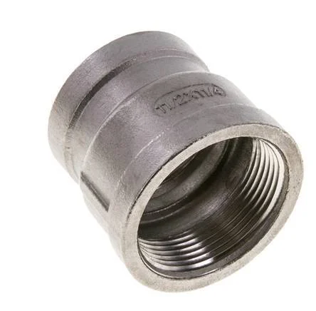 This sleeve (reducing socket) is designed with reducing NPT threads (round body). Connection 1 has female NPT 1 1/2 inch threads. Connection 2 has female NPT 1 1/4 inch threads. It is a straight fitting. It is made out of stainless steel (1.4408). At 20 °C (68 °F), it can handle a maximum pressure of 16 bar (232 psi).