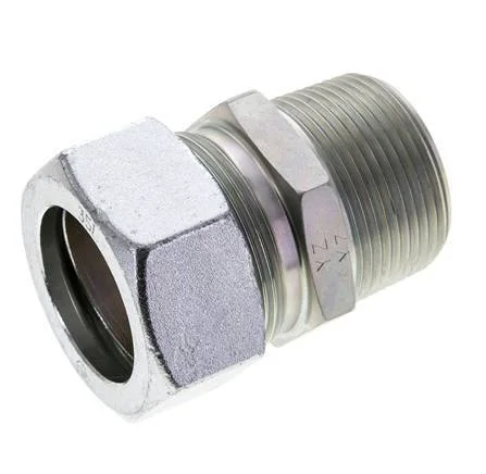 This straight screw in connection is designed with male threads and a cutting ring fitting connection. Connection 1 has male NPT 1 1/4 inch threads. Connection 2 is a 35 mm cutting ring. It is a straight fitting. It is made out of steel and is galvanic/electrolytic zinc plated for surface protection. It is suitable for media within a temperature range of -40 °C to 120 °C (-40 °F to 248 °F). At 20 °C (68 °F), it can handle a maximum pressure of 160 bar (2321 psi). According to the DIN 2353, it has an L (light) load class. It is made in accordance with the DIN EN ISO 8434-1 (DIN 2353). They have a 3-part design.