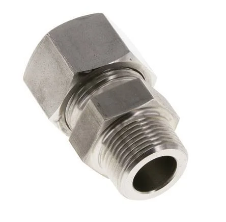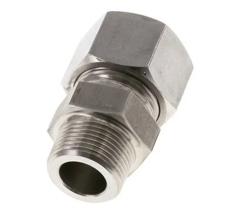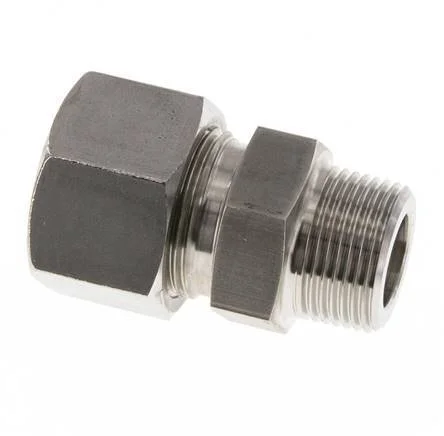 This stainless steel 1.4571 straight screw in connection is designed with one male threaded connection and one cutting ring connection port. Connection 1 is a 20 mm cutting ring with a M30x2 union nut. Connection 2 has male R 3/4 inch threads. The maximum pressure is 400 bar (5800 psi). The fitting is suitable for temperatures from -60 to 400 °C (-76 to 752 °F). It is made in accordance with DIN EN ISO 8434-1 (DIN 2353).