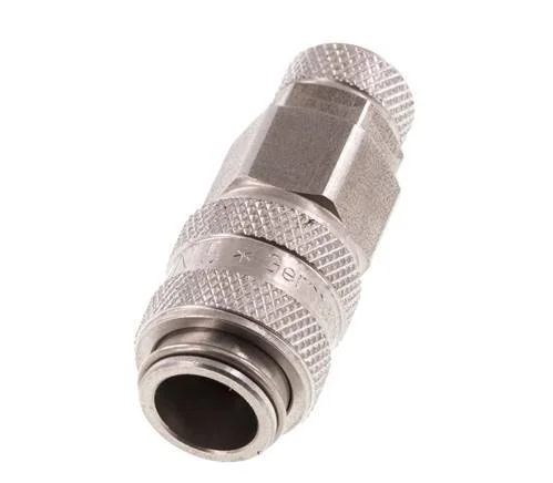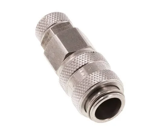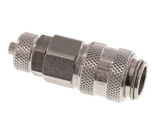Stainless steel DN 5 air coupling socket with a union nut for 4×6 mm hoses. A pneumatic coupling is used to quickly connect air tools to a compressed air line. The coupling requires two parts: the socket (female) and the plug or nipple (male part). When disconnected, the coupling automatically shuts off to maintain the line pressure.