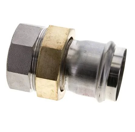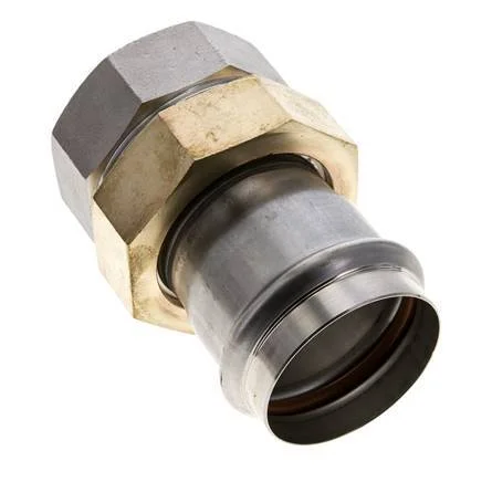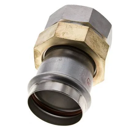 This is a union straight press fitting made from stainless steel 1.4404. The fitting has a female press port and a female threaded port. Connection 1 is designed for a tube with an outer diameter of 54 mm and connection 2 has Rp 2 inch female threads. The fitting has an FKM sealing ring. It also has a flat seal made of centellen. The maximum pressure is 16 bar (232 psi). The fitting is suitable for temperatures from -20 to 200 °C (-4 to 392 °F). Temporary, the max temperature can be +280 °C (536 °F). The fitting length is 115 mm.